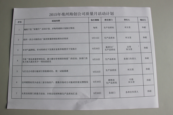 ? ? 月初,由公司領(lǐng)導組織相關(guān)部門(mén)研討,編制下發(fā)了2015年質(zhì)量月活動(dòng)計劃。按照活動(dòng)計劃的安排,公司于9月上旬對出廠(chǎng)板材質(zhì)量控制標準組織了研討修訂,并組織銷(xiāo)售人員學(xué)習,提高了市場(chǎng)銷(xiāo)售人員對公司板材質(zhì)量及性能認知水平。