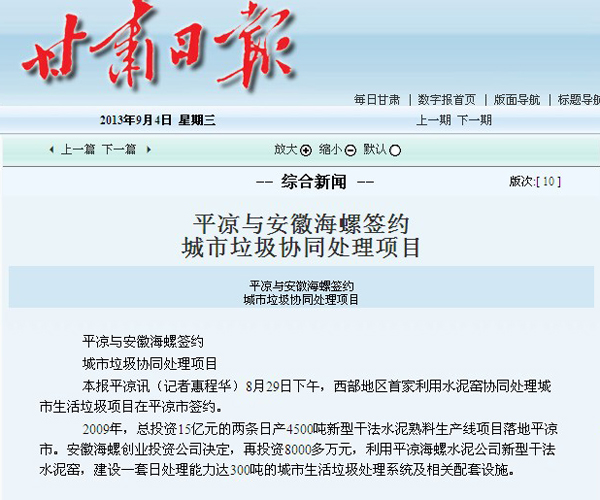 ??? 2009年,總投資15億元的兩條日產(chǎn)4500噸新型干法水泥熟料生產(chǎn)線(xiàn)項目落地平?jīng)鍪?。安徽海螺?chuàng )業(yè)投資公司決定,再投資8000多萬(wàn)元,利用平?jīng)龊B菟喙拘滦透煞ㄋ喔G,建設一套日處理能力達300噸的城市生活垃圾處理系統及相關(guān)配套設施。