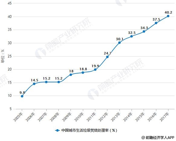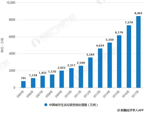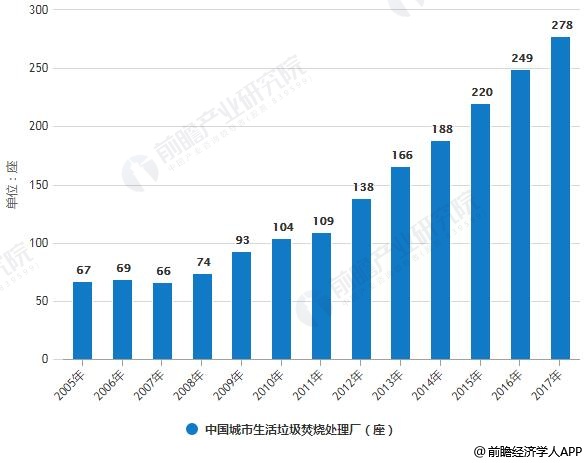 ? ? 和傳統的堆肥、填埋等處理方式相比,焚燒具有處理效率高、占地面積小、對環(huán)境影響相對較小等優(yōu)點(diǎn),更能滿(mǎn)足城市生活垃圾處理對減量化和無(wú)害化的要求。并且焚燒處理的方式還能利用焚燒產(chǎn)生的熱能,實(shí)現垃圾的資源化,這些優(yōu)勢使得垃圾焚燒處理在近些年逐漸得到了較為廣泛的應用與推廣。焚燒垃圾場(chǎng)的數量從2005年的67座增長(cháng)到2017年的286座,焚燒垃圾處理量由2005年的791萬(wàn)噸增長(cháng)到2017年的8463.3萬(wàn)噸。焚燒處理率由2005年的9.8%上升到2017年的40.2%。