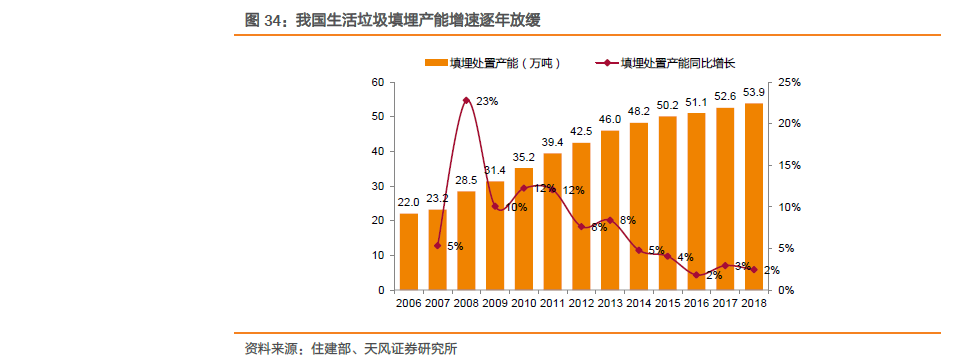 垃圾填埋是垃圾焚燒的最主要競爭工藝,近年來(lái)產(chǎn)能增速明顯放緩。生活垃圾無(wú)害化處置方式主要包括填埋、焚燒、堆肥等。2018年,填埋和焚燒處置產(chǎn)能占無(wú)害化處置產(chǎn)能的比例分別為54.6%、41.7%。填埋在早期因技術(shù)簡(jiǎn)單、成本低等特點(diǎn)得到大規模應用,但占地面積較大,與緊缺的土地資源天然具有對抗性,近年來(lái)產(chǎn)能增速明顯放緩;焚燒具有占地面積小、能源利用高等特點(diǎn),對垃圾填埋的替代作用逐年顯現,產(chǎn)能占比持續提升。
