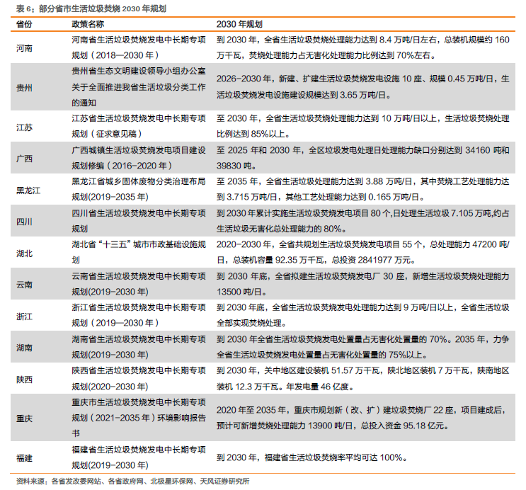 我國焚燒占比相較國外仍有較大提升空間,從各省份產(chǎn)能規劃來(lái)看,未來(lái)5-10年垃圾焚燒產(chǎn)能建設需求較旺盛。近兩年各省市生活垃圾焚燒中長(cháng)期規劃紛紛出臺,多地明確指出要新增垃圾焚燒廠(chǎng)以提高焚燒處理能力,并設置了較高的焚燒占比規劃目標。例如江蘇省提出在2022年-2030年新(改,擴)建垃圾焚燒廠(chǎng)39座,預計新增垃圾焚燒處置能力4.5萬(wàn)噸/日;福建省提出到2030年生活垃圾焚燒率平均可達100%。對比部分地區2020年存量產(chǎn)能與2030年規劃產(chǎn)能,仍有接近兩倍的提升空間,預示未來(lái)5-10年垃圾焚燒產(chǎn)能建設需求較旺盛。