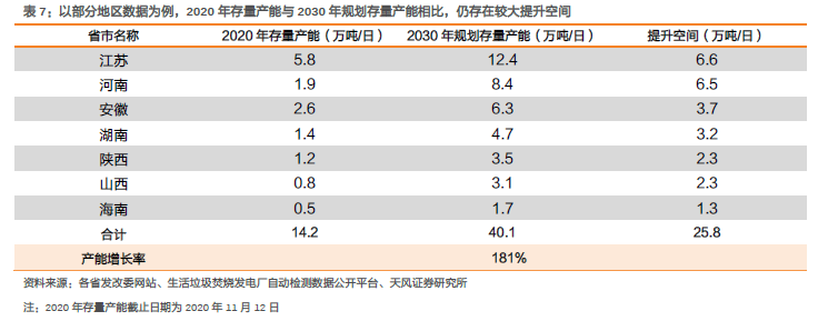 垃圾填埋“新增難+存量減”背景下,垃圾焚燒替代屬性凸顯,產(chǎn)能占比有望進(jìn)一步提升。垃圾焚燒作為垃圾填埋的最主要替代方式,具有占地面積小、處理效率高、環(huán)境污染小、能源利用高等多方面優(yōu)勢。2020年8月,國家發(fā)展改革委、住房城鄉建設部和生態(tài)環(huán)境部等三部委聯(lián)合印發(fā)《城鎮生活垃圾分類(lèi)和處理設施補短板強弱項實(shí)施方案》,明確提出“原則上地級以上城市以及具備焚燒處理能力的縣(市、區),不再新建原生生活垃圾填埋場(chǎng),現有生活垃圾填埋場(chǎng)主要作為垃圾無(wú)害化處理的應急保障設施使用?!苯刂聊壳?,已有多個(gè)省市提出“原生生活垃圾零填埋”的規劃目標,垃圾焚燒替代屬性凸顯。