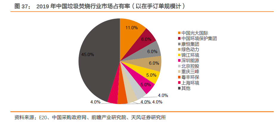 垃圾焚燒企業(yè)加速“跑馬圈地”,在手訂單規模不斷擴大。前些年在一系列政策大力支持下,各城市競相建立垃圾焚燒發(fā)電廠(chǎng),并在國內掀起投資并購浪潮。行業(yè)外企業(yè)通過(guò)并購快速切入垃圾焚燒領(lǐng)域,行業(yè)內企業(yè)借助并購迅速擴大自身規模。例如,2011年,水務(wù)領(lǐng)域龍頭首創(chuàng )股份通過(guò)收購新環(huán)保能源,將業(yè)務(wù)拓展至固廢處理領(lǐng)域;2013年,瀚藍環(huán)境收購創(chuàng )冠環(huán)保(中國)有限公司100%股權,垃圾規劃處理能力一年內提升四倍。并購趨勢下,龍頭企業(yè)在手規模不斷擴大,截至2019年,在手訂單規模前十企業(yè)市占率達55%,前三占有率分別為11/6/6%。