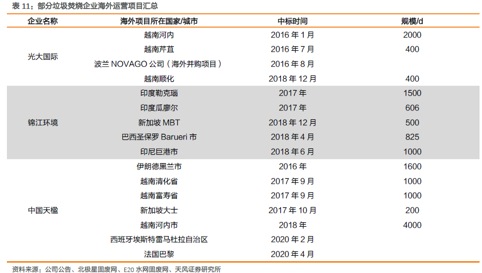 海外拓展穩步推進(jìn),龍頭企業(yè)擁有多個(gè)海外運營(yíng)項目。隨著(zhù)國內焚燒設備及技術(shù)的日漸成熟,國內垃圾焚燒發(fā)電企業(yè)已由早期的技術(shù)引進(jìn)者轉向設備、技術(shù)輸出者,并通過(guò)海外并購等方式迅速開(kāi)拓海外市場(chǎng)。目前已有多家企業(yè)擁有數個(gè)海外投資運營(yíng)的垃圾焚燒發(fā)電項目,涵蓋東南亞、歐洲乃至美洲等多個(gè)區域。