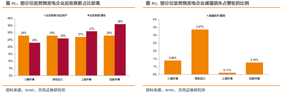 初始投資較大疊加存量項目補貼拖欠,垃圾發(fā)電企業(yè)普遍呈現高負債、高財務(wù)費用率的特征。垃圾焚燒項目前期投資較高,企業(yè)投產(chǎn)高峰階段資本支出較大,導致現金流承壓;同時(shí)為了滿(mǎn)足融資需求,企業(yè)財務(wù)杠桿也較高,導致財務(wù)費用率較高。此外,在存量項目補貼拖欠的影響下,一方面,企業(yè)賬面存在較多應收賬款,資金回籠受限;另一方面,計提的大額減值損失對企業(yè)利潤也有一定侵蝕。以幾家垃圾焚燒龍頭企業(yè)2019年財務(wù)數據為例,應收賬款占流動(dòng)資產(chǎn)及營(yíng)收的比例較高,減值損失占營(yíng)收的平均比例也達到1.2%。