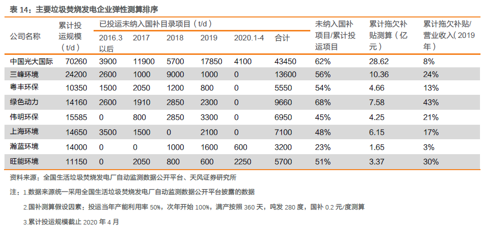 存量項目拖欠的補貼解決后,企業(yè)現金流有望得到改善。補貼發(fā)放不僅可以通過(guò)改善現金流,降低財務(wù)杠桿來(lái)減少財務(wù)費用,同時(shí)應收賬款收回,前期應收賬款計提減值沖回,也將增加公司當期業(yè)績(jì)。截止2020年4月,全國垃圾焚燒運營(yíng)規模50萬(wàn)噸/日,其中未納入目錄項目占比約48%,累計拖欠補貼金額約130億元。從企業(yè)具體情況來(lái)看,我們測算出2016-2020年各家企業(yè)的累計拖欠補貼,并以累計拖欠補貼金額占2019年營(yíng)收的比例作為利好彈性的觀(guān)測值。若存量補貼發(fā)放,對垃圾焚燒發(fā)電企業(yè)將帶來(lái)較大的現金流改善。