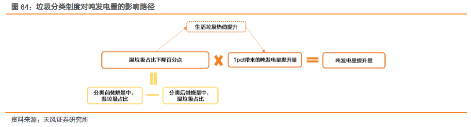 ⑤由垃圾分類(lèi)導致的噸發(fā)提升量:據《深圳市生活垃圾分類(lèi)對垃圾焚燒影響的研究》相關(guān)內容,我們推算出當濕垃圾在入爐垃圾中的占比降低1pct時(shí),噸垃圾發(fā)電量可以提升2.2-3.0Kwh,保守假定濕垃圾占比下降1pct會(huì )帶來(lái)噸發(fā)電量提升2.2Kwh。