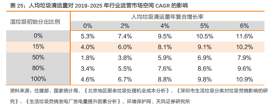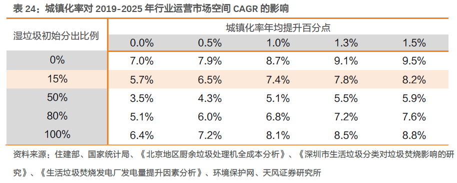 綜合考慮垃圾分類(lèi)帶來(lái)的“量減”+“熱值升”,以及城鎮化率提升、技術(shù)工藝優(yōu)化等影響因素,據我們測算,2019-2025年垃圾焚燒行業(yè)運營(yíng)收入CAGR約7%,垃圾分類(lèi)減量化影響下仍有增長(cháng)空間。核心假設如下: