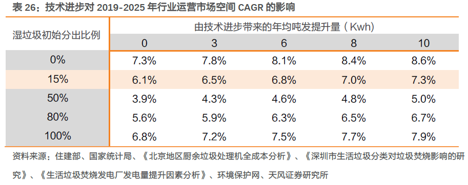 ⑥由技術(shù)工藝優(yōu)化導致的噸發(fā)提升量:據《生活垃圾焚燒發(fā)電廠(chǎng)發(fā)電量提升因素分析》介紹,李坑一廠(chǎng)借助中溫超高壓技術(shù),噸垃圾發(fā)電量達350~360kWh,以及在垃圾熱值相近的情況下,中溫次高壓余熱鍋爐發(fā)電量增加17%。我們假定技術(shù)優(yōu)化帶來(lái)噸發(fā)電量提升50Kwh,由2019年300Kwh線(xiàn)性提升至2025年350Kwh。