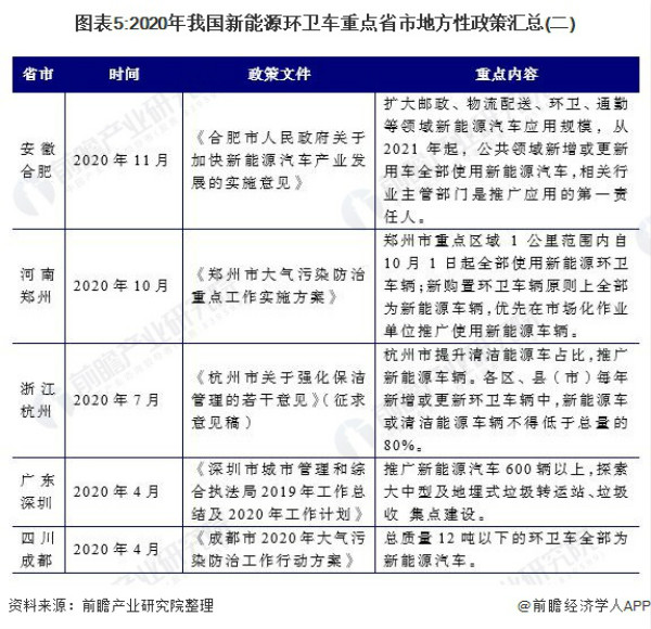 在地方層面,以省會(huì )城市為代表的大中型城市2020年密集出臺規劃政策,均對包括環(huán)衛車(chē)在內的公共領(lǐng)域用車(chē)新能源化提出要求,以最近的11月19日合肥發(fā)布的《加快新能源汽車(chē)產(chǎn)業(yè)發(fā)展的實(shí)施意見(jiàn)》為例,意見(jiàn)明確提出從2021年起,公共領(lǐng)域新增或更新用車(chē)全部使用新能源汽車(chē),相關(guān)行業(yè)主管部門(mén)是推廣應用的第一責任人。