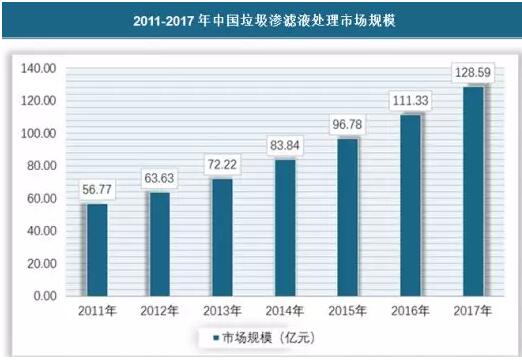? ? 與之一同增長(cháng)的還有市場(chǎng)規模,相關(guān)數據顯示,2017年我國垃圾滲濾液處理市場(chǎng)規模達到128.59億元,較2016年多了17.26億元,增長(cháng)了15.5%。