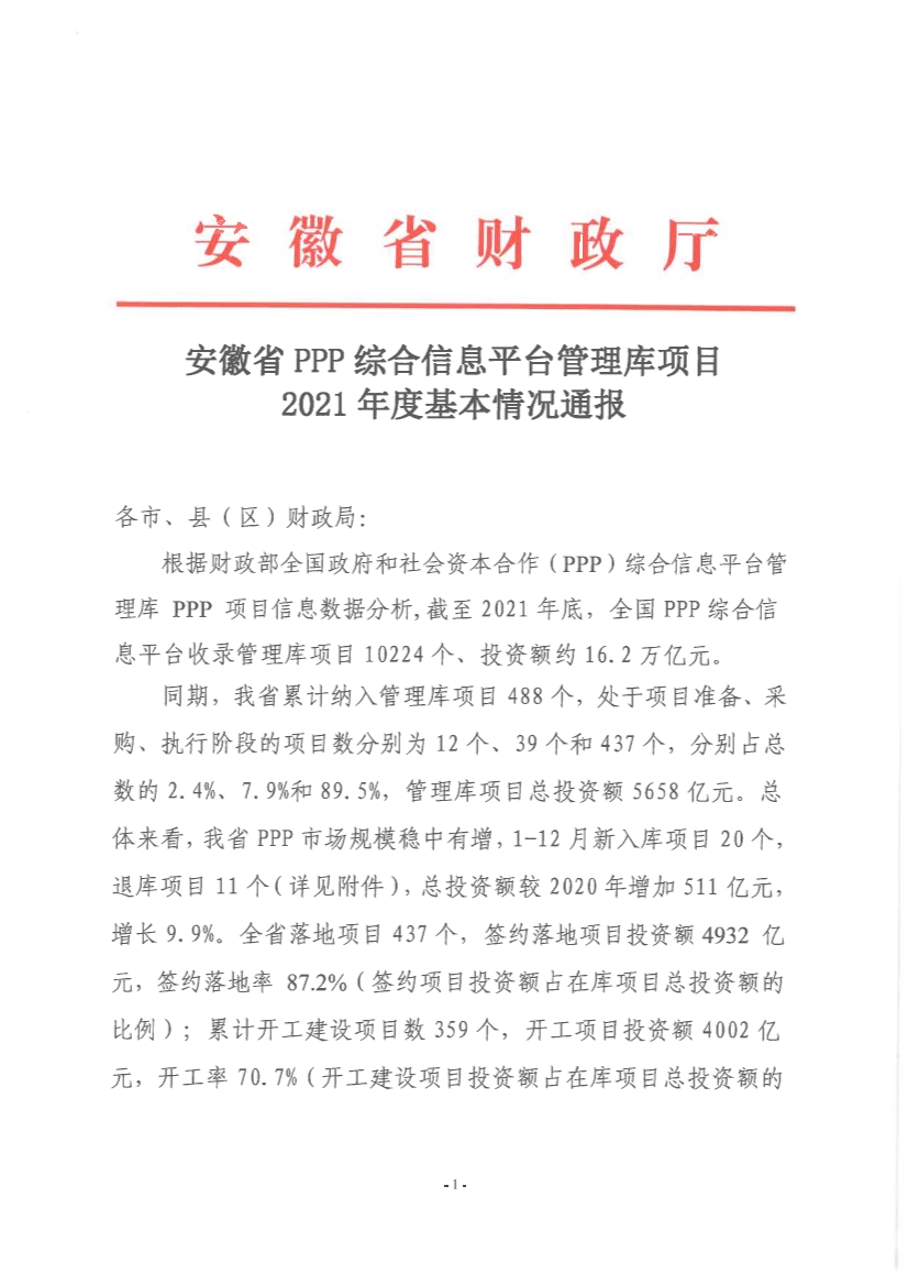 近日,安徽省財政廳發(fā)布《安徽省PPP綜合信息平臺管理庫項目2021年度基本情況通報》,安徽省所開(kāi)展的PPP項目涉及交通運輸、市政工程、城鎮綜合開(kāi)發(fā)、生態(tài)建設和環(huán)境保護等,其中生態(tài)建設和環(huán)境保護項目68個(gè),總投資687億元。