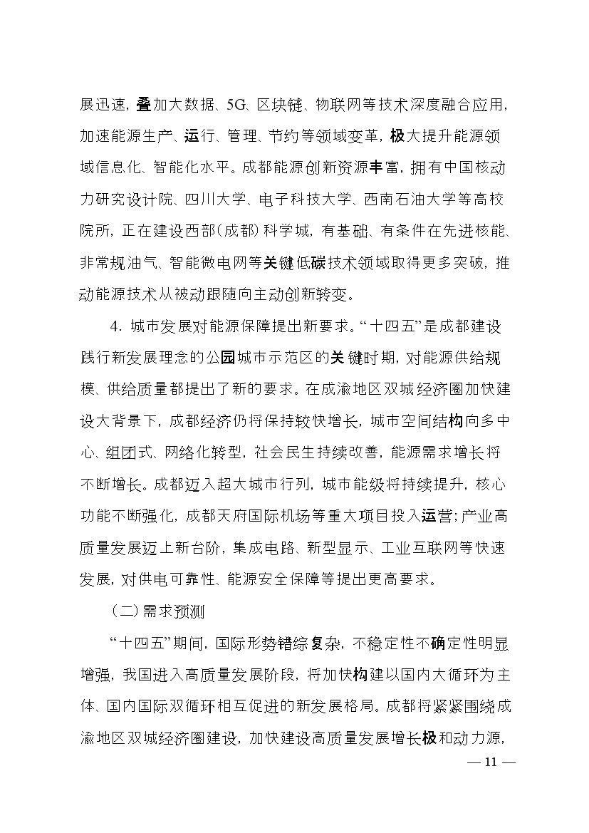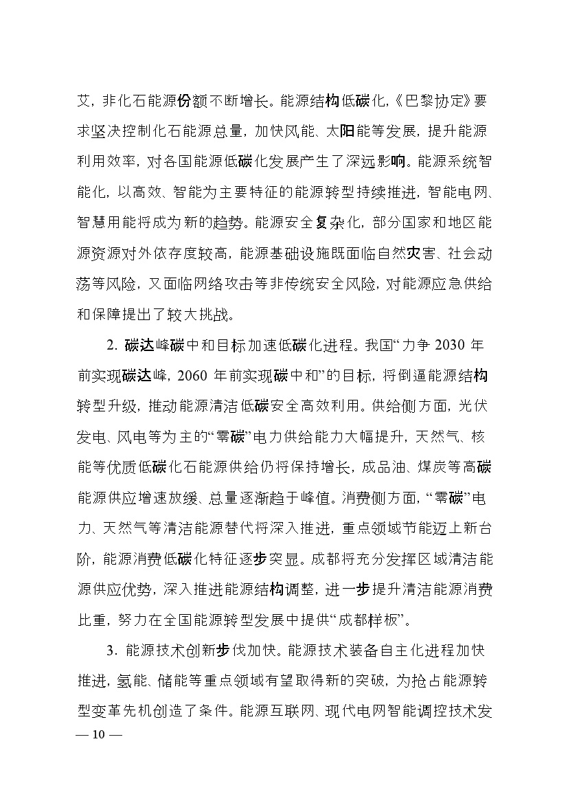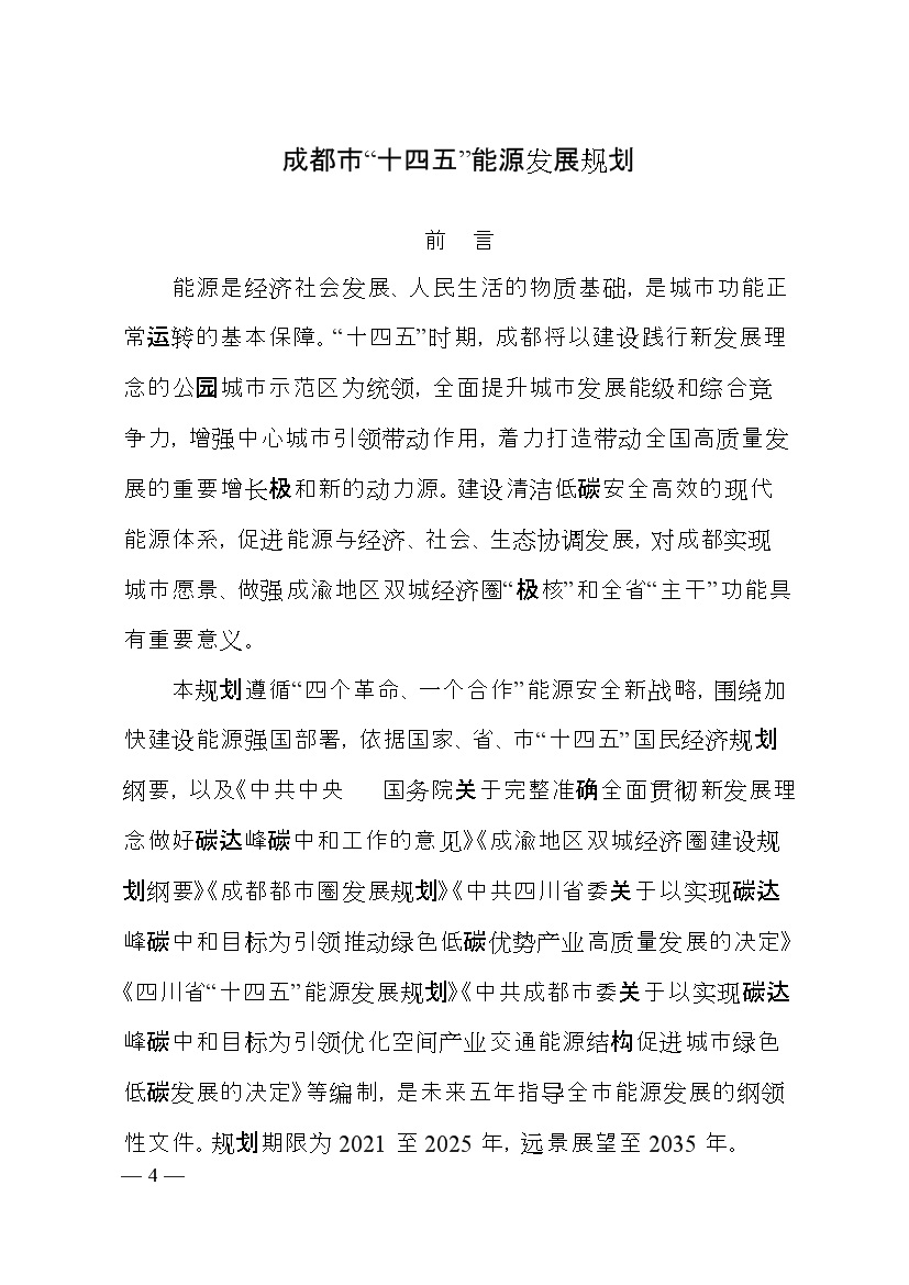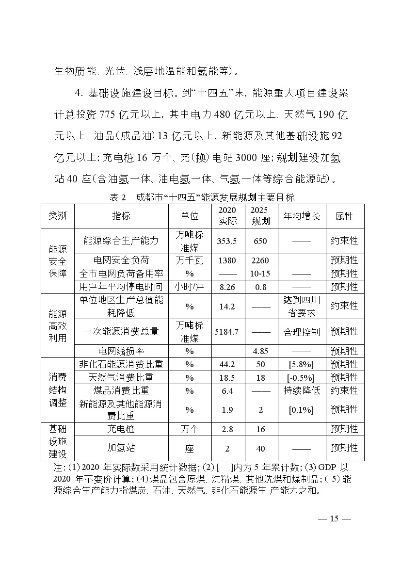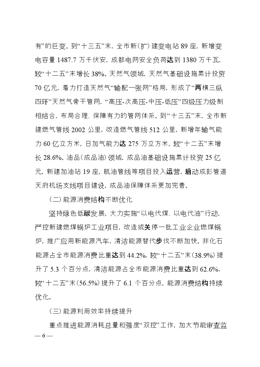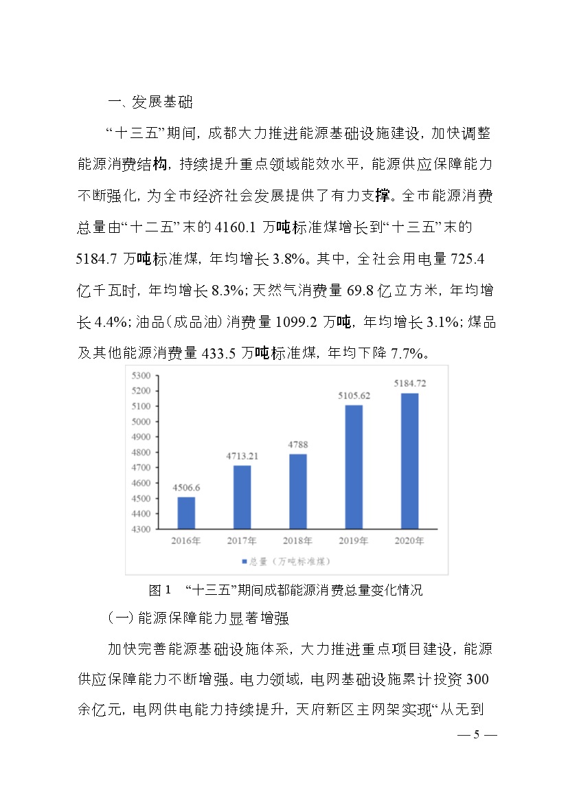 成都市人民政府印發(fā)《成都市“十四五”能源發(fā)展規劃》,明確了以創(chuàng )新發(fā)展為動(dòng)力,以強化保障能力為抓手,加快構建新型電力系統,持續推進(jìn)清潔能源替代,優(yōu)化能源消費結構,全力提升能源利用效率發(fā)展思路。并提出總量控制目標、消費結構目標、能源安全保障、等能源節約目標、基礎設施建設等發(fā)展目標。