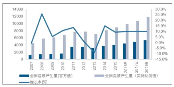 ? ? 2015年全國危廢產(chǎn)生量為3976萬(wàn)噸,但是由于該數據來(lái)源于企業(yè)自主申報,明顯低于實(shí)際產(chǎn)生量。2007年危廢的產(chǎn)生量為4574萬(wàn)噸,大幅高于當年《統計年報》所統計的數字1079萬(wàn)噸。污染源普查公告的數字接近真實(shí)值,其與企業(yè)自主申報值得比值為4.24。由于2011年危廢申報下限由10kg下降至1kg,危廢當年的自主申報產(chǎn)生量大幅上升至3431萬(wàn)噸,假設當年實(shí)際危廢增長(cháng)率與前三年復合增長(cháng)率相同,則當年實(shí)際估測危廢產(chǎn)量為7651萬(wàn)噸,實(shí)際估測值與申報值之間比值下降為2.23,進(jìn)一步假設此后該比例都相同,則預測2018年全國危廢的實(shí)際產(chǎn)量在1.18億噸。而行業(yè)內一般認為實(shí)際危廢產(chǎn)量在一億噸左右。