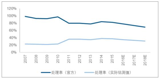 ? ? 從處理量的角度看,2015年危廢處理量為1207萬(wàn)噸,綜合利用量為2079萬(wàn)噸,這部分危廢通過(guò)正規渠道進(jìn)行了處理,并且數據相對真實(shí)。據此測算,當年危廢處理率為37.08%,也就是說(shuō)全國還有5578萬(wàn)噸的危廢通過(guò)不正規渠道進(jìn)行處理。