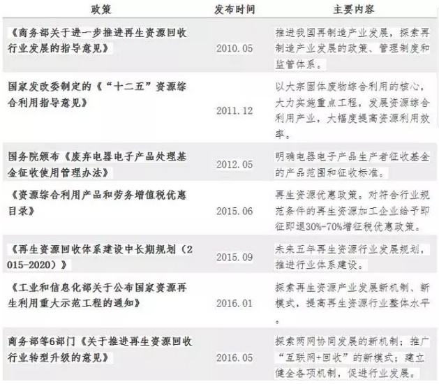 ? ? 2015年7月,國務(wù)院發(fā)布《國務(wù)院關(guān)于積極推進(jìn)“互聯(lián)網(wǎng) ”行動(dòng)的指導意見(jiàn)》,引導再生資源回收行業(yè)向信息化、自動(dòng)化、智能化方向發(fā)展,促進(jìn)再生資源交易透明化、便利化。2016年5月,商務(wù)部等國家六部委印發(fā)了《關(guān)于推進(jìn)再生資源回收行業(yè)轉型升級的意見(jiàn)》。強調推廣“互聯(lián)網(wǎng) 回收”的新模式;建立完善各項機制,促進(jìn)行業(yè)發(fā)展。