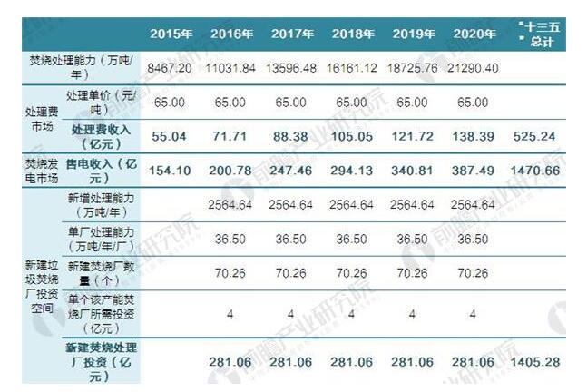 ? ? 按照垃圾焚燒規劃新增處理能力對市場(chǎng)空間進(jìn)行測算,“十三五”期間垃圾焚燒處理費市場(chǎng)空間總計為525.24億元,焚燒發(fā)電預計收入總額為1470.66億元,兩者合計運營(yíng)收入約2000億元;此外,新增處理能力所需的建設投資總計1405億元,垃圾焚燒市場(chǎng)空間巨大。
