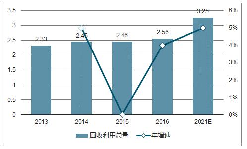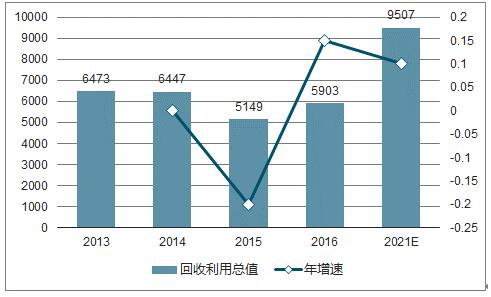 ? ? 十大廢棄物回收利用量變化相對穩定,年增速在0%-5%,回收利用總值受大宗商品價(jià)格變化而波動(dòng)較大。2016年,我國十大類(lèi)別的再生資源回收總量約為2.56億噸,同比增長(cháng)3.7%,回收總值約為5902.8億元,同比增長(cháng)14.7%。預計到2021年,我國主要再生資源利用總量將達到3.25億噸,復合增速5%,再生資源回收價(jià)值達到9506.52億元,復合增速10%。