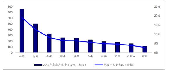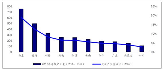 ? ? 危廢跨省運輸需要填寫(xiě)危險廢物轉移聯(lián)單,經(jīng)過(guò)相關(guān)部門(mén)審批,流程較為復雜,減弱了危廢處理企業(yè)之間的同業(yè)競爭,當地規模較大的企業(yè)有明顯的地域優(yōu)勢,但同時(shí)也不利于危廢企業(yè)的做大做強。根據環(huán)保部發(fā)布的數據,工業(yè)危廢產(chǎn)生量排名前十的?。ㄖ陛犑?、自治區)分別是山東、青海、新疆、湖南、江蘇、云南、浙江、廣東、內蒙古、四川,合計占比達74.5%。東江環(huán)保作為行業(yè)的龍頭企業(yè),按照已獲得的危廢處理資質(zhì)計算,市占率也僅在3%左右。