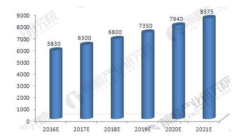 2016-2021年中國工業(yè)固體廢物市場(chǎng)容量預測(單位:億元)