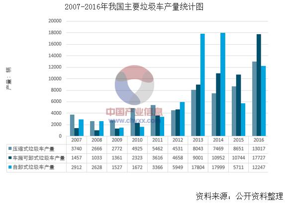 ? ? 據統計:2016年我國壓縮式垃圾車(chē)產(chǎn)量為13017輛;車(chē)廂可卸式垃圾車(chē)產(chǎn)量為17727輛;自卸式垃圾車(chē)產(chǎn)量為12247輛。