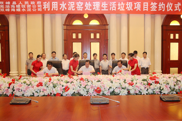 ? ? 2014年6月29日上午,雙峰縣人民政府、蕪湖海螺投資公司、雙峰海螺公司在蕪湖海螺國際會(huì )議中心東海廳正式簽署了《關(guān)于雙峰縣利用水泥窯協(xié)同處理城市生活垃圾項目合作協(xié)議》,雙峰縣縣長(cháng)楊維,縣委常委、副縣長(cháng)龍燕青,縣人大常委會(huì )副主任李仲喬;海螺創(chuàng )業(yè)總經(jīng)理紀勤應、副總經(jīng)理李大明;雙峰海螺副總經(jīng)理萬(wàn)天靜等參加了簽約儀式。