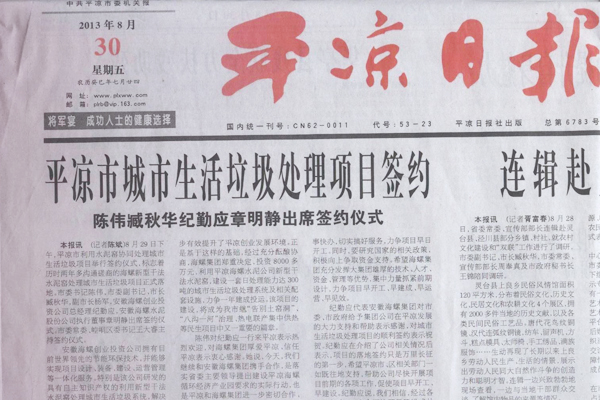 On the afternoon of Aug 29th, the signing ceremony of municipal garbage treatment via cement kiln project agreement was held in Pingliang, which marked the project formally settling in Pingliang after two years’ negotiation.